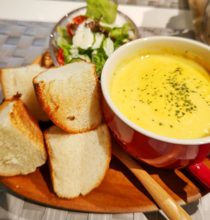 | スープ (ミニサラダ&パン付き) ![]() ¥800 スープのみ ¥600 1~5の中から 味をお選びいただけます。 ※季節によってスープが変わります。 | 1.パンプキン かぼちゃ、玉ねぎ、バター、牛乳 2.クラムチャウダー 二枚貝の剥身、タマネギ、ジャガイモ、セロリ 3.ミネストローネ ベーコン、玉ねぎ、にんじん、セロリ、ズッキーニ 、キャベツ 、トマト 4.コーン とうもろこし、玉ねぎ、牛乳、バター 5.カレー 20種類のスパイスカレー、 季節の焼き野菜、そぼろチャーシュー、豚のお出汁で煮込んでいます。 | 1.![]() ![]() 2. ![]() ![]() 3. ![]() ![]() 4. ![]() ![]() 5. ![]() ![]() |